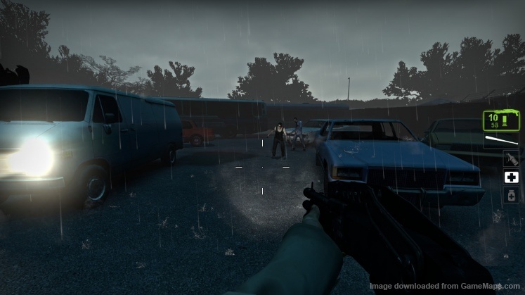 地图中还加入了天气系统,在第二与第三章的室外场景中,天空像官方战役沼泽激战后两章一样下着暴雨。伴随着雷鸣,一波一波的尸潮不停的向玩家涌来,极具真实感。救援章的地点在一座露天体育场。由于大部分区域被雨水覆盖,玩家行动受限,一旦在水中遭遇坦克,处境将十分艰难。
