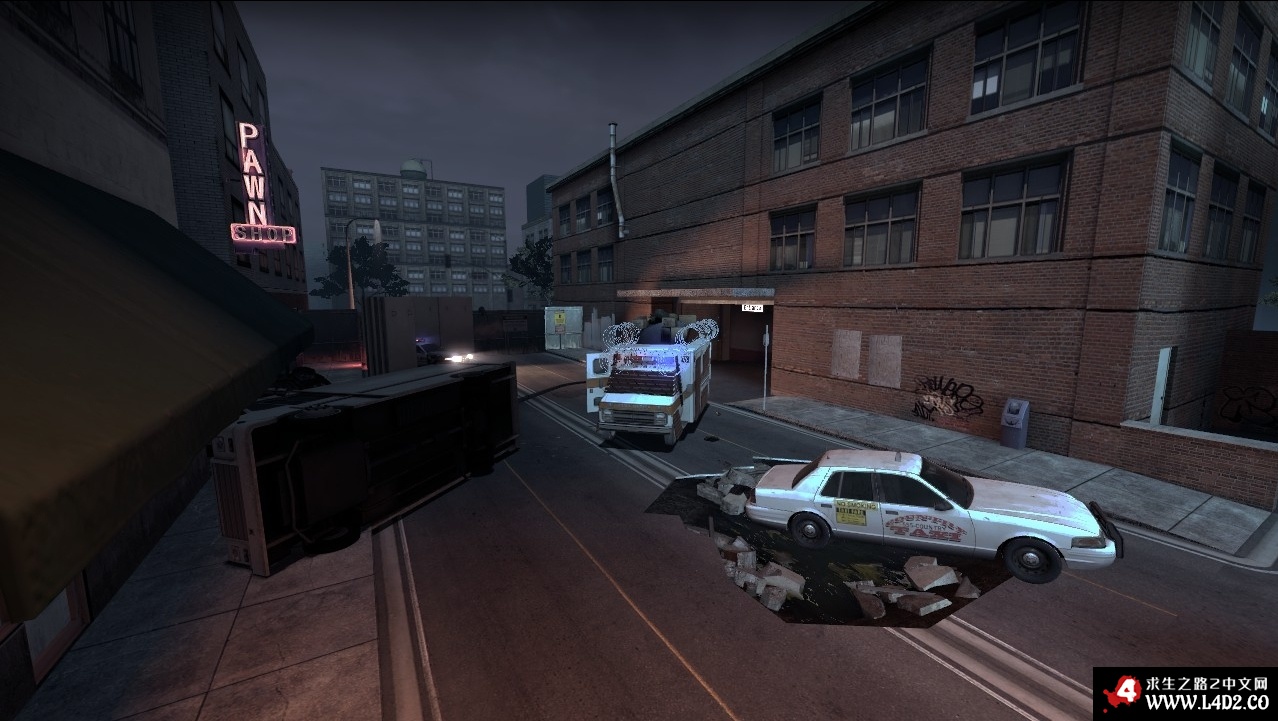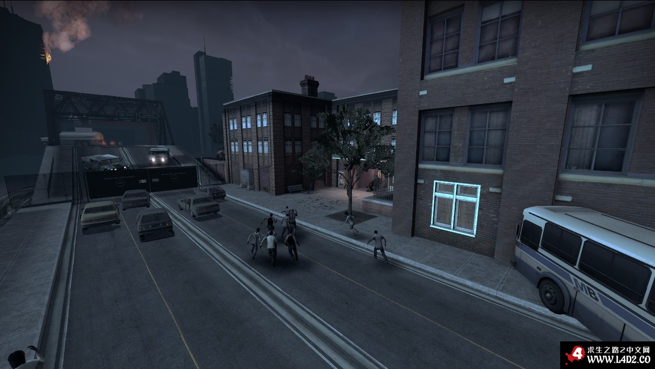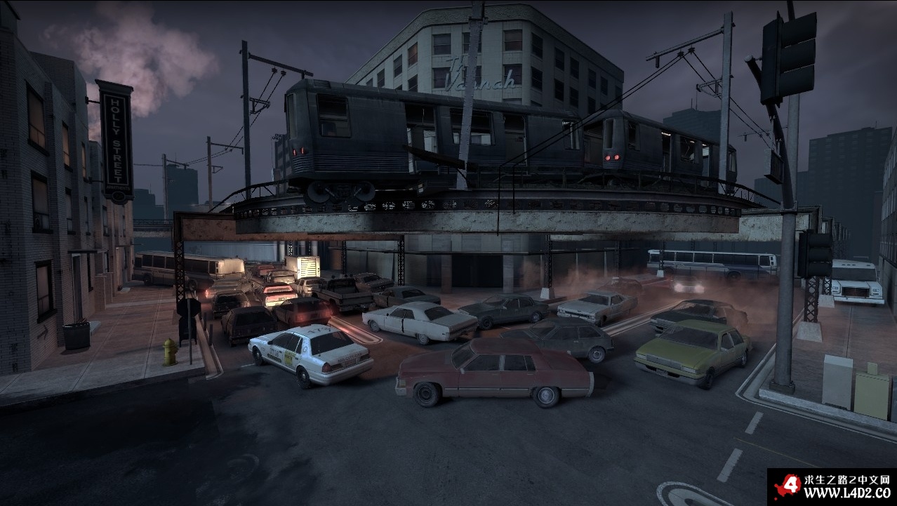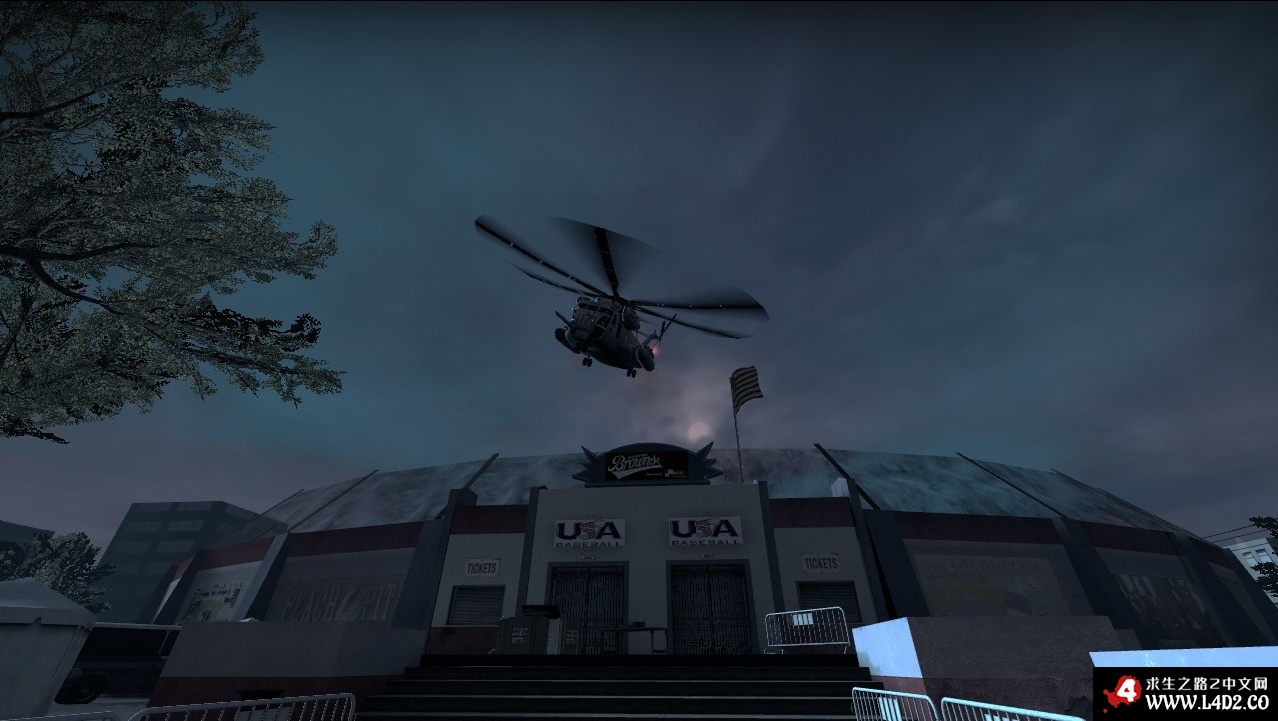 游戏一开始玩家就被隔开,在大楼中寻找物资。作者将玩家设置成两组而不是以往的四人同行,实在是一次大胆的尝试,但这样的结果还不算坏,反而还有出人意料的效果,让玩家感到新鲜。在大楼一番查看后来到楼下,将找到的可乐交给停车场里的驾驶员,和他一起去市中心的体育馆。这可以说是玩过的地图里,除了一二代8名主角和救援人员(大部分还都只是以语音的方式出现),还有僵尸特感之外,为数不多的新生命体了。尽管还是没有驾驶员的身影,但和一辆卡车一起总比和一群僵尸一起好得多……第二关还需要玩家帮助卡车清理路上的汽车残骸,再反过来让驾驶员帮助我们带路穿过充满毒气的隧道,有着特殊元素的地图就是吸引人的。到达体育场找到军方,玩家还被委托帮忙抵挡周围僵尸的来袭,掩护撤离行动。尽管只需要防守东(B区)、西(C区)和北(A区)这三片区域,但这也算是玩家第一次在地图里接到并执行一个像样的任务,也算是一种新的游戏方式了。然后在直升机上玩家又遇到了突然发生尸变的状况,飞机坠毁。这让人刚放下的心又提了起来,穿过城区躲在地铁站里防守,军队也很给面子地进行了帮助,将