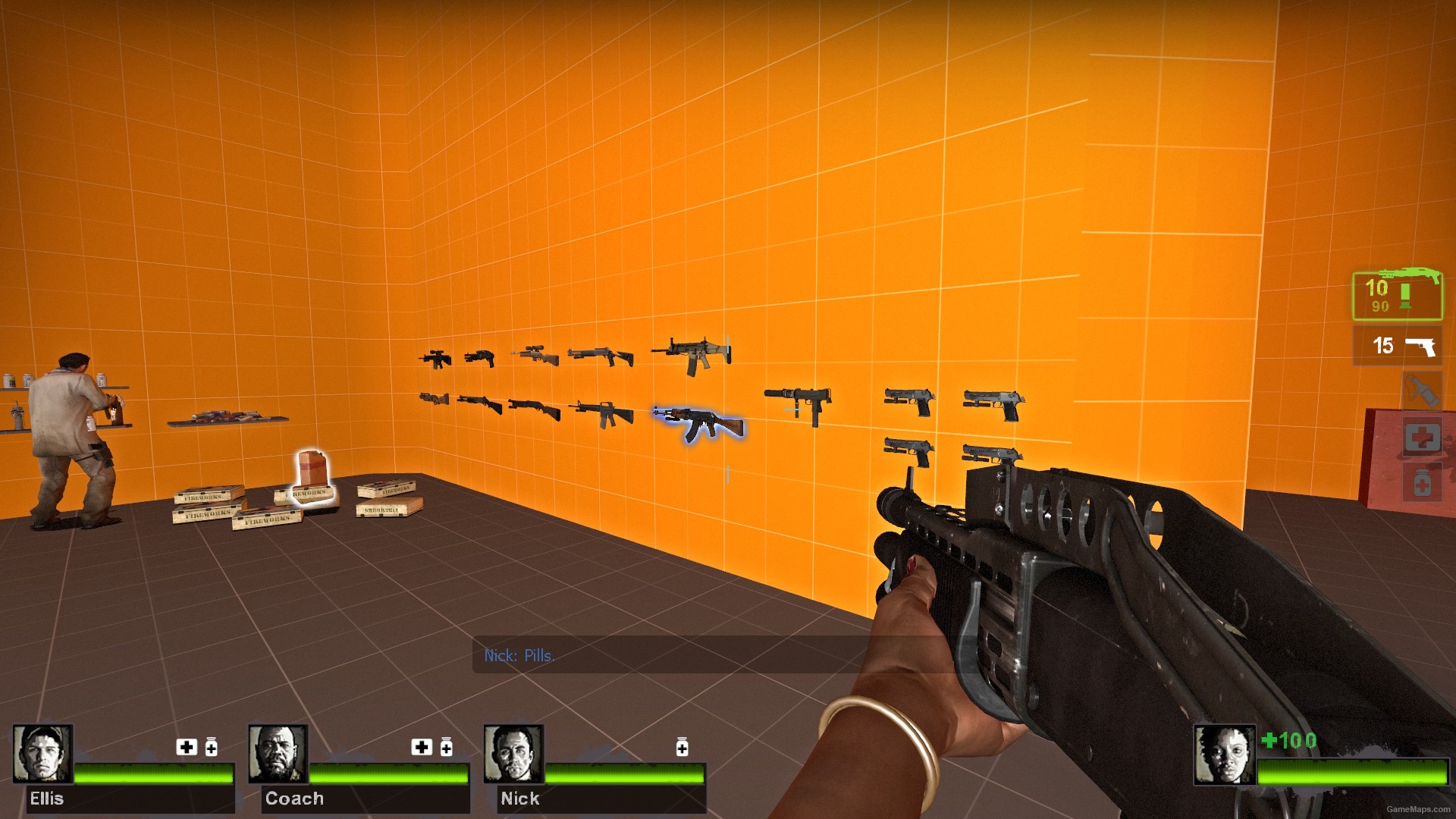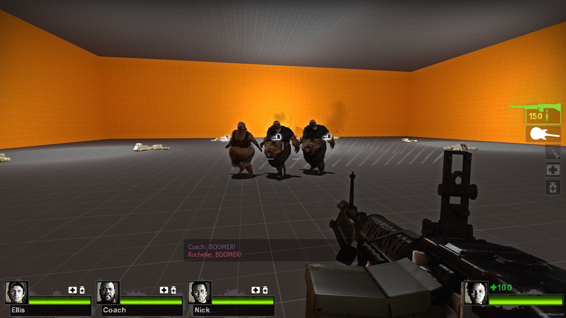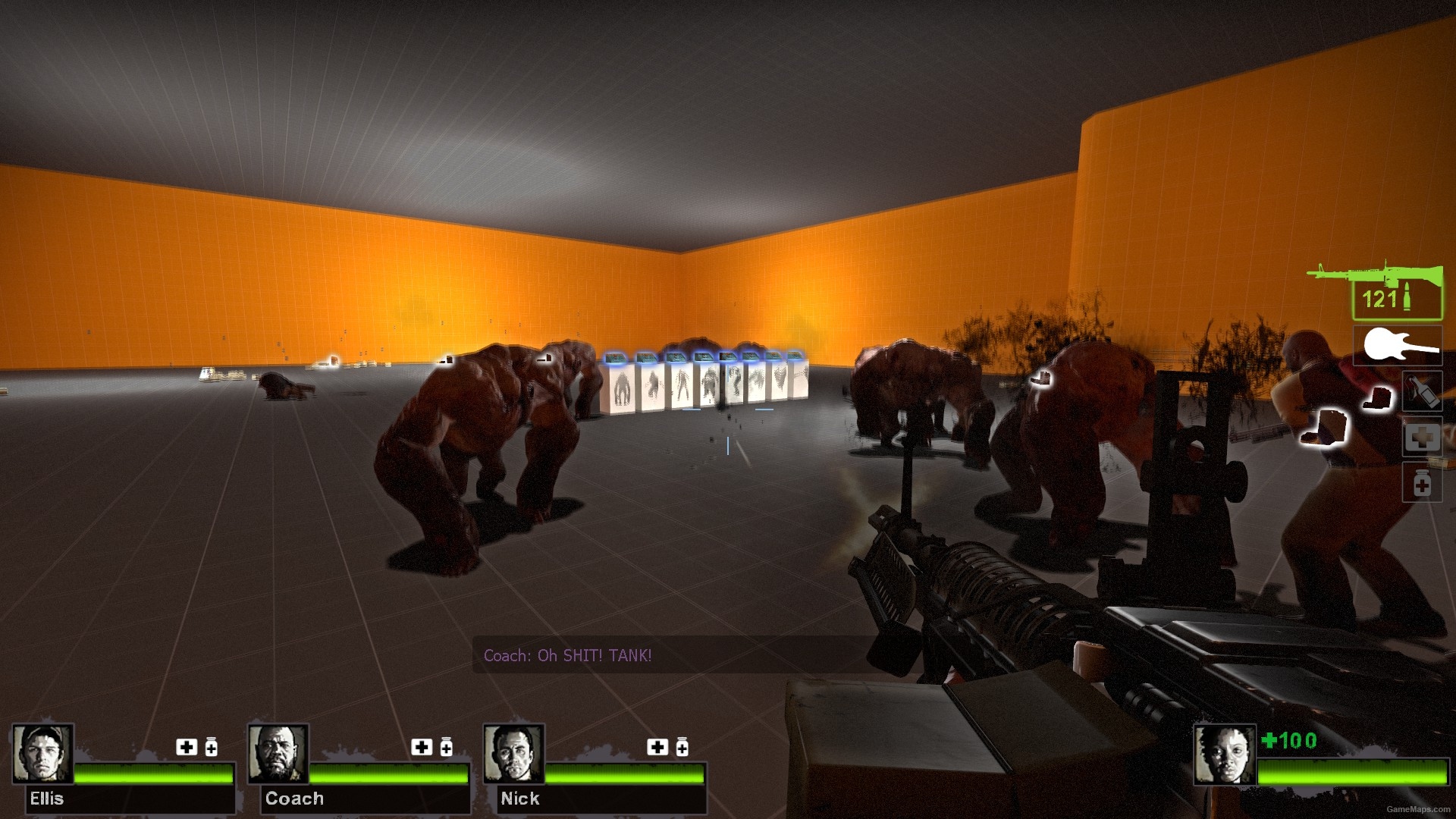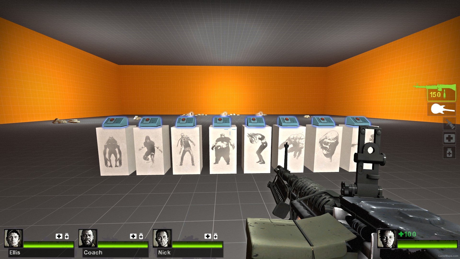 特感的数量及特感种类是可以由玩家控制的,但在初始的控制按钮刷出后,系统还会自动刷新其他特感。由于是一代移植的训练地图,补给中不包含近战武器,需要的同学可通过秘籍来获取。